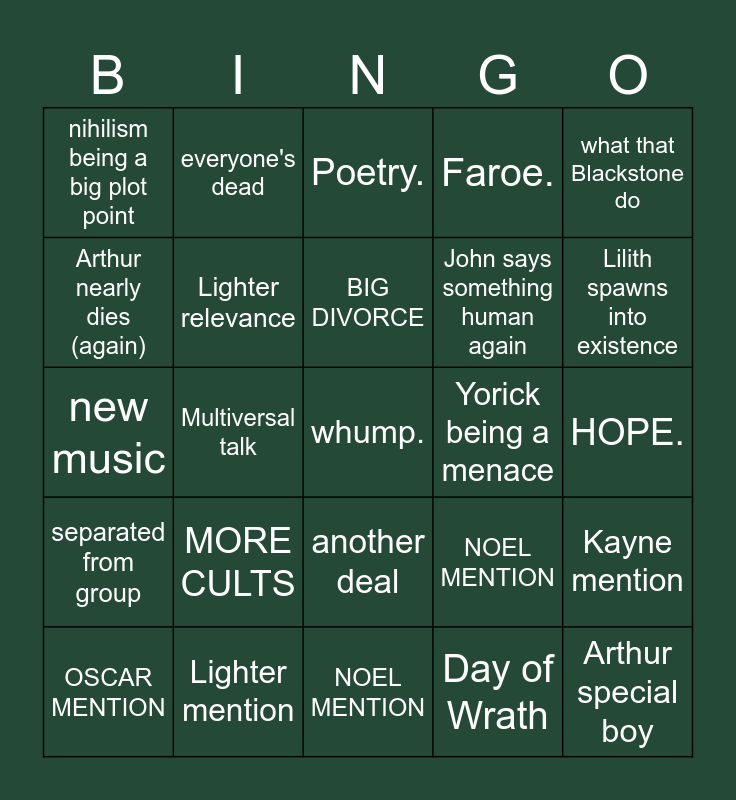 This bingo card has a free space and 26 words: OSCAR MENTION, MORE CULTS, another deal, Day of Wrath, Lilith spawns into existence, nihilism being a big plot point, everyone's dead, Poetry., John says something human again, Kayne mention, Arthur nearly dies (again), Multiversal talk, NOEL MENTION, Arthur special boy, new music, falls off horse, BIG DIVORCE, Yorick being a menace, what that Blackstone do, separated from group, Lighter relevance, the loss of something, Faroe., HOPE., NOEL MENTION and Lighter mention.