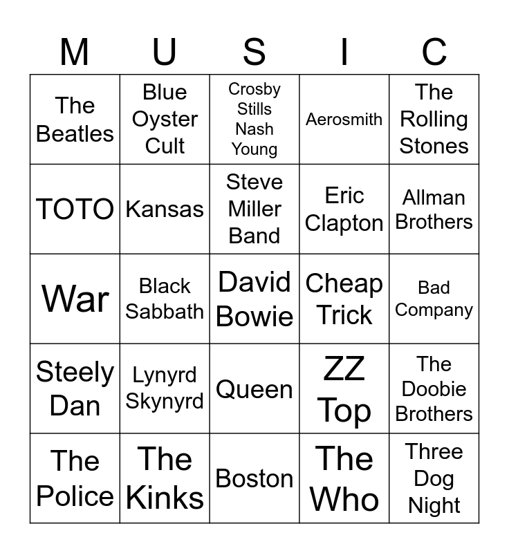 This bingo card has 49 words: Joe Walsh, David Bowie, AC/DC, Boston, Lynyrd Skynyrd, Fleetwood Mac, Blue Oyster Cult, Pink Floyd, TOTO, Led Zeppelin, Kansas, Aerosmith, The Doobie Brothers, ZZ Top, Lou Reed, CCR, Steve Miller Band, Cheap Trick, George Harrison, The Rolling Stones, Black Sabbath, The Who, The Beatles, Eric Clapton, Eagles, Allman Brothers, The Police, Rod Stewart, Queen, Steely Dan, Derek & the Dominoes, Paul McCartney/Wings, The Guess Who, Stealers Wheel, The Kinks, Supertramp, Manfred Man's Earth Band, Jackson Browne, Bad Company, Thin Lizzy, The Doors, Jefferson Starship, Three Dog Night, Neil Young, War, Crosby Stills Nash Young, Dr. John, Elton John and Grateful Dead.