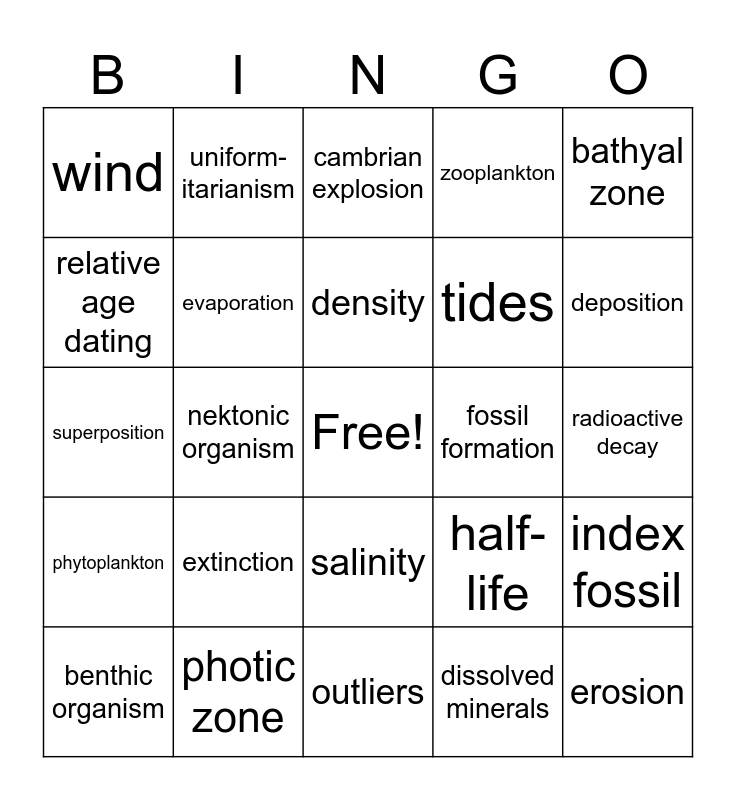 This bingo card has a free space and 26 words: salinity, dissolved minerals, density, photic zone, bathyal zone, wind, relative age dating, uniform-itarianism, radioactive decay, half-life, tides, superposition, index fossil, benthic organism, nektonic organism, plankton, zooplankton, phytoplankton, cambrian explosion, erosion, deposition, outliers, fossil formation, extinction, evaporation and sediment deposit.