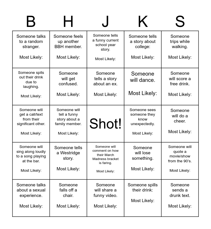 This bingo card has a free space and 24 words: Someone tells a Westridge story. Most Likely:, Someone falls off a chair. Most Likely:, Someone tells a story about an ex. Most Likely:, Someone talks about a sexual experience. Most Likely:, Someone trips while walking. Most Likely:, Someone talks to a random stranger. Most Likely:, Someone spits out their drink due to laughing. Most Likely:, Someone feels up another BBH member. Most Likely:, Someone sees someone they know unexpectedly. Most Likely:, Someone will comment on how their March Madness bracket is faring. Most Likely:, Someone will dance. Most Likely:, Someone will get a call/text from their significant other. Most Likely:, Someone will lose something. Most Likely:, Someone will quote a movie/show from the 90’s. Most Likely:, Someone will get confused. Most Likely:, Someone spills their drink: Most Likely:, Someone will do a cheer. Most Likely:, Someone tells a funny current school year story. Most Likely:, Someone will score a free drink. Most Likely:, Someone will tell a funny story about a family member. Most Likely:, Someone sends a drunk text. Most Likely:, Someone will sing along loudly to a song playing at the bar. Most Likely:, Someone tells a story about college: Most Likely: and Someone will share a funny video. Most Likely:.