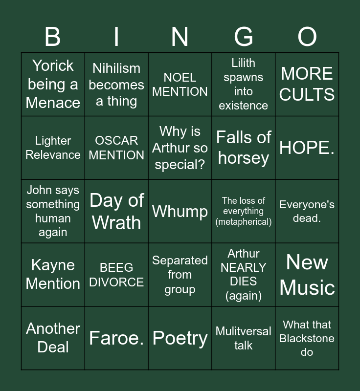 This bingo card has a free space and 24 words: BEEG DIVORCE, Faroe., Why is Arthur so special?, Another Deal, MORE CULTS, Yorick being a Menace, Lighter Relevance, Nihilism becomes a thing, The loss of everything (metapherical), Separated from group, Falls of horsey, John says something human again, Arthur NEARLY DIES (again), New Music, OSCAR MENTION, Mulitversal talk, Everyone's dead., NOEL MENTION, HOPE., Day of Wrath, What that Blackstone do, Kayne Mention, Lilith spawns into existence and Poetry.