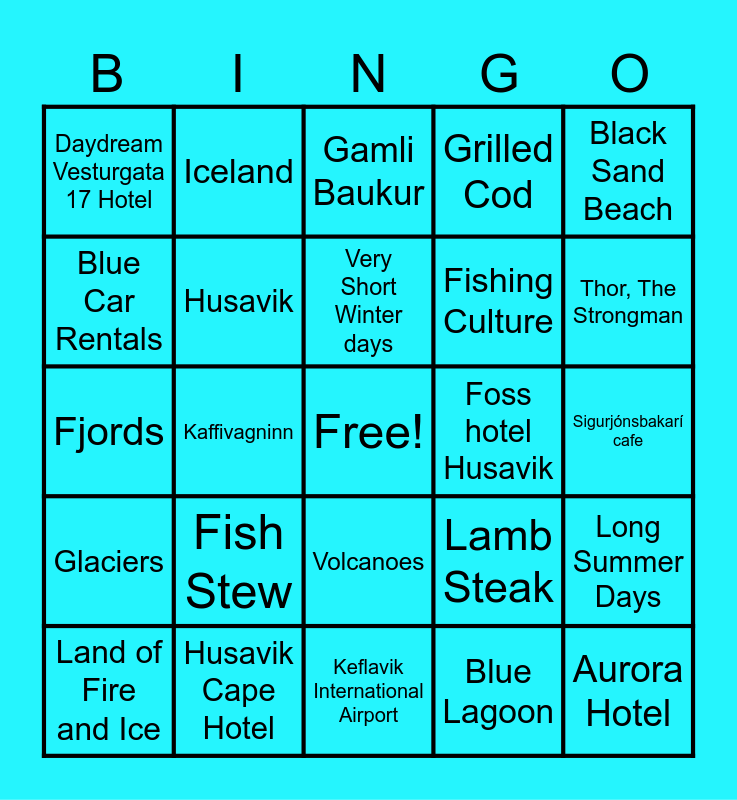 This bingo card has a free space and 29 words: Land of Fire and Ice, Reykjavik, Kaffivagninn, Eyja Guldsmeden Hotel, Daydream Vesturgata 17 Hotel, Gamli Baukur, Husavik, Fish Stew, Foss hotel Husavik, Husavik Cape Hotel, Sigurjónsbakarí cafe, Aurora Hotel, Keflavik International Airport, Blue Lagoon, Thor, The Strongman, Vikings, Volcanoes, Glaciers, Black Sand Beach, Fjords, Lamb Steak, Off-Roading, Fishing Culture, Blue Car Rentals, Grilled Cod, Iceland, Long Summer Days, Very Short Winter days and Backpacking or Hiking.
