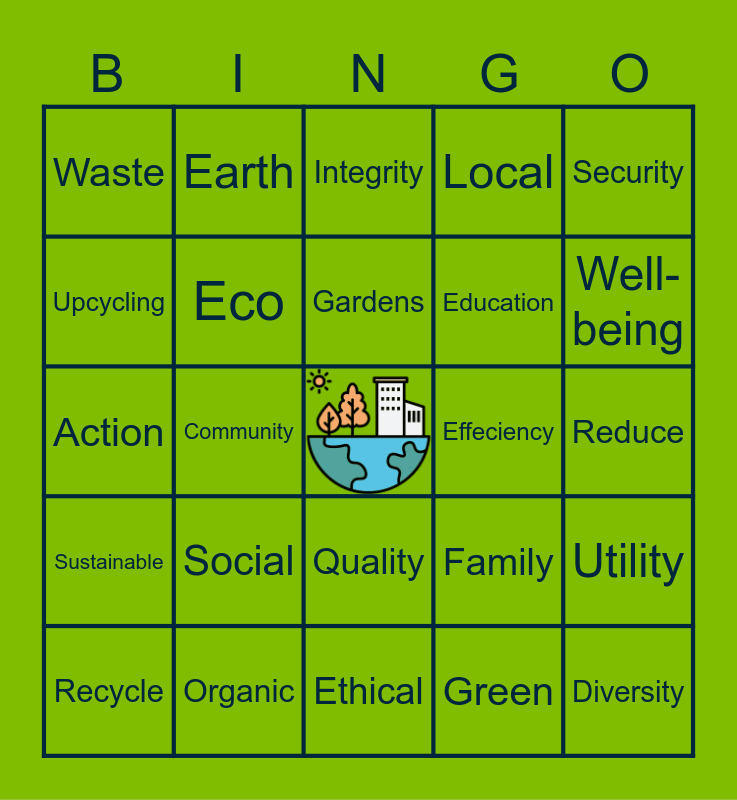 This bingo card has a free space and 29 words: Recycle, Energy, Community, Inclusive, Waste, Integrity, Eco, Social, Effeciency, Organic, Reduce, Diversity, Ethical, Green, Well-being, Accessibility, Quality, Sustainable, Security, Action, Family, Health, Education, Upcycling, Local, Earth, Utility, Gardens and Clean.