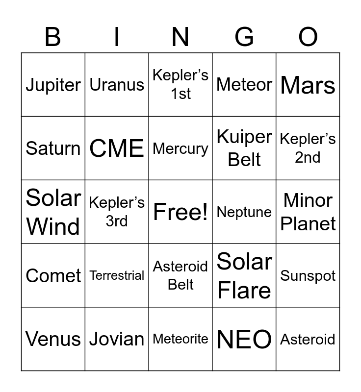 This bingo card has a free space and 24 words: Terrestrial, Jovian, Mercury, Venus, Mars, Jupiter, Saturn, Uranus, Neptune, Asteroid Belt, Kuiper Belt, Solar Wind, Solar Flare, Sunspot, CME, NEO, Minor Planet, Kepler’s 1st, Kepler’s 2nd, Kepler’s 3rd, Asteroid, Comet, Meteor and Meteorite.