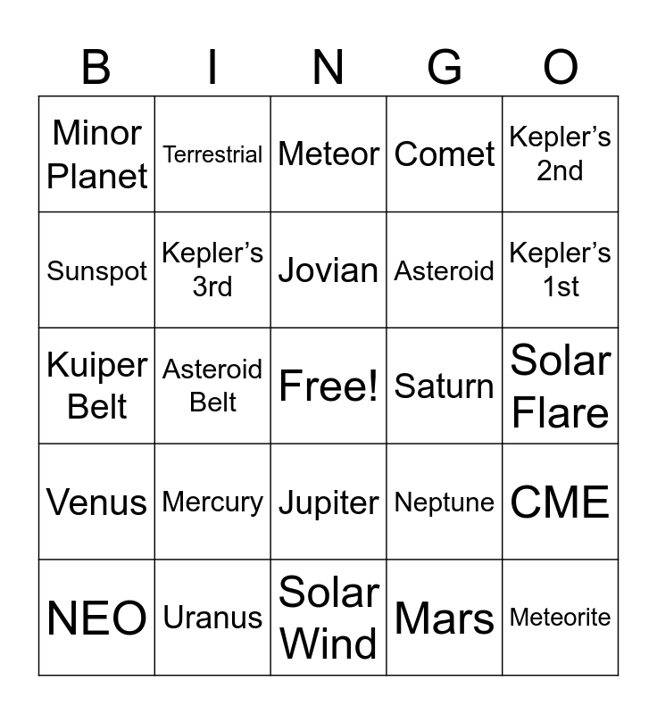 This bingo card has a free space and 24 words: Mercury, Uranus, Jovian, NEO, Kepler’s 2nd, Minor Planet, Sunspot, Terrestrial, Saturn, Jupiter, Asteroid, Kuiper Belt, Neptune, CME, Kepler’s 3rd, Mars, Solar Flare, Meteor, Kepler’s 1st, Asteroid Belt, Meteorite, Venus, Comet and Solar Wind.