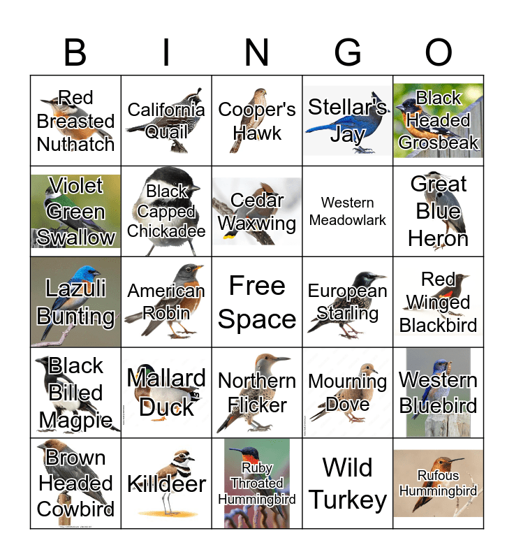 This bingo card has 29 images, a free space and 33 words: American Crow, American Goldfinch, American Robin, Bald Eagle, Black Billed Magpie, Black Capped Chickadee, Black Headed Grosbeak, Brown Headed Cowbird, California Quail, Canada Jay, Cedar Waxwing, Cooper's Hawk, Dark Eyed Junco, Downy Woodpecker, European Starling, Great Blue Heron, Killdeer, Lazuli Bunting, Mallard Duck, Mourning Dove, Northern Flicker, Red Backed Chickadee, Red Breasted Nuthatch, Red Winged Blackbird, Ruby Throated Hummingbird, Rufous Hummingbird, Stellar's Jay, Western Meadowlark, Violet Green Swallow, Western Bluebird, Western Tanager, Wild Turkey and Wood Duck.