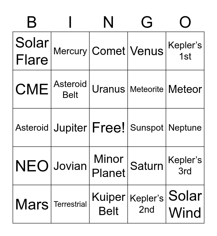 This bingo card has a free space and 24 words: Jovian, Terrestrial, Uranus, Mars, Kepler’s 1st, Solar Flare, CME, Mercury, Sunspot, Minor Planet, Meteorite, Asteroid, Saturn, Kepler’s 3rd, Asteroid Belt, Kepler’s 2nd, Neptune, Comet, Meteor, Jupiter, Solar Wind, NEO, Venus and Kuiper Belt.