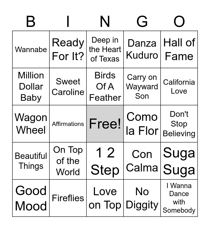 This bingo card has a free space and 29 words: Good Mood, Hooked on a Feeling, Affirmations, Spirit in the Sky, Wannabe, Deep in the Heart of Texas, Sweet Caroline, On Top of the World, Como la Flor, Fireflies, Don't Stop Believing, I Wanna Dance with Somebody, Love on Top, No Diggity, California Love, Boot Scootin Boogie, 1 2 Step, Beautiful Things, Hall of Fame, Wagon Wheel, Con Calma, One Less Lonely Girl, Carry on Wayward Son, Million Dollar Baby, Danza Kuduro, Ready For It?, Suga Suga, Birds Of A Feather and Pink Pony Club.