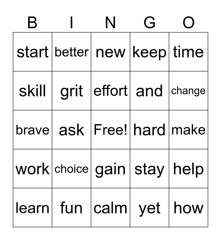 This bingo card has a free space and 34 words: can, yet, try, again, work, grit, time, learn, better, find, effort, new, will, proud, hard, change, fun, brave, choice, stay, gain, grow, start, make, calm, how, keep, improve, and, skill, joy, ask, help and able.