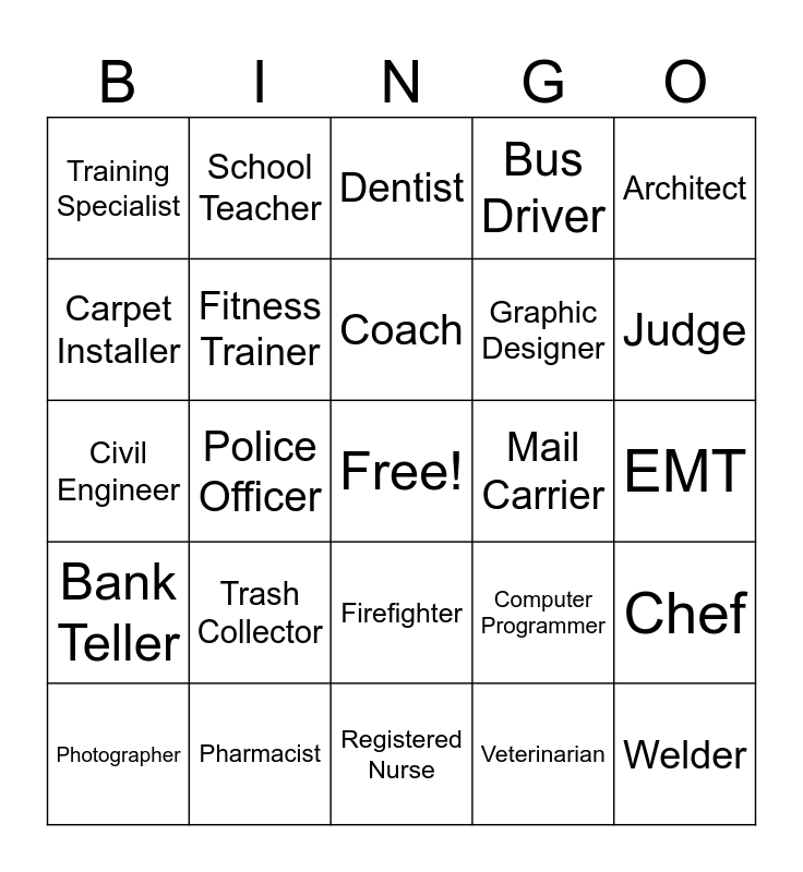 This bingo card has a free space and 31 words: Registered Nurse, Travel Agent, Police Officer, Nutritionist, Training Specialist, Dentist, Fitness Trainer, Computer Programmer, Mail Carrier, Veterinarian, EMT, Welder, Auto Mechanic, Hairdresser, Judge, Librarian, Chef, Trash Collector, Bank Teller, Firefighter, Architect, Biochemist, Photographer, School Teacher, Graphic Designer, Carpet Installer, Bus Driver, Civil Engineer, Pharmacist, Coach and Pilot.
