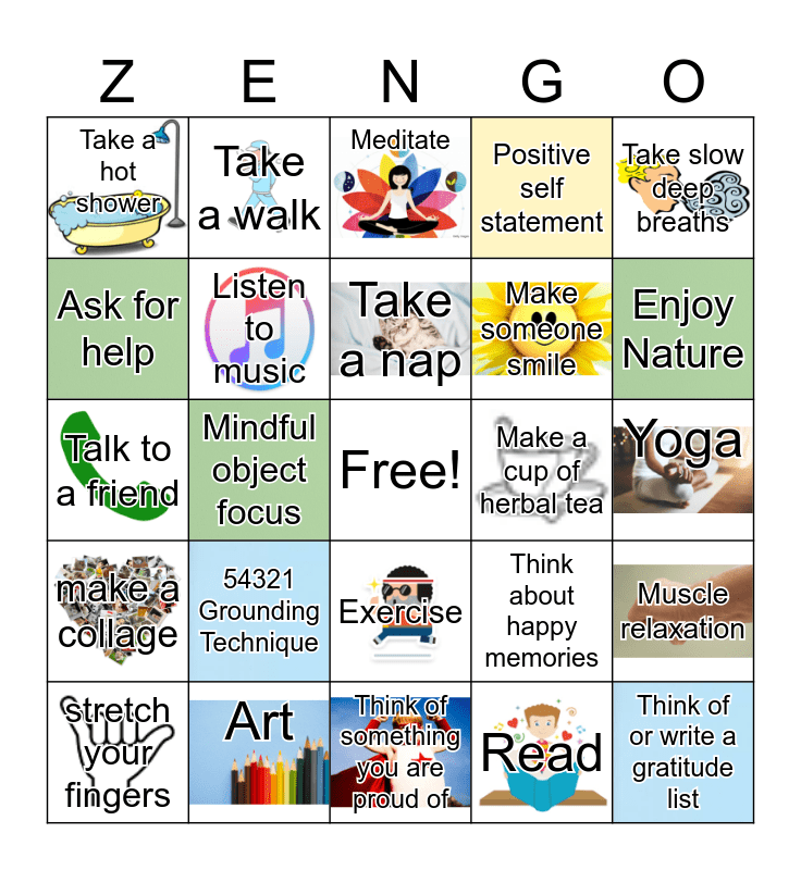 This bingo card has 23 images, a free space and 24 words: 54321 Grounding Technique, Art, Take a nap, stretch your fingers, Take slow deep breaths, Take a hot shower, Ask for help, Take a walk, Make a cup of herbal tea, Exercise, Make someone smile, Talk to a friend, Think about happy memories, Muscle relaxation, Listen to music, Read, Yoga, Meditate, Enjoy Nature, Mindful object focus, Think of or write a gratitude list, make a collage, Positive self statement and Think of something you are proud of.