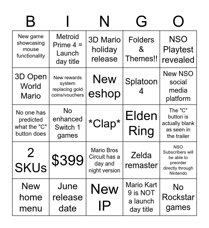 This bingo card has a free space and 24 words: $399, June release date, New eshop, New home menu, NSO Playtest revealed, New game showcasing mouse functionality, 3D Open World Mario, Metroid Prime 4 = Launch day title, Elden Ring, Mario Bros Circuit has a day and night version, Splatoon 4, No one has predicted what the "C" button does, Zelda remaster, NSO Subscribers will be able to preorder directly through Nintendo, New rewards system replacing gold coins/vouchers, Mario Kart 9 is NOT a launch day title, The "C" button is actually blank as seen in the trailer, 3D Mario holiday release, New NSO social media platform, No enhanced Switch 1 games, No Rockstar games, 2 SKUs, Folders & Themes!! and New IP.