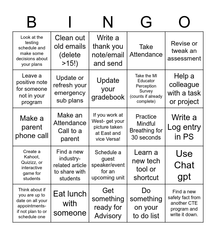 This bingo card has a free space and 24 words: Find a new industry-related article to share with students, Eat lunch with someone, Update your gradebook, Think about if you are up to date on all your appointments- if not plan to or schedule one, Revise or tweak an assessment, Look at the testing schedule and make some decisions about your plans, Leave a positive note for someone not in your program, Clean out old emails (delete >15!), Practice Mindful Breathing for 30 seconds, Schedule a guest speaker/event for an upcoming unit, Take the MI Educator Perception Survey (counts if already complete), Make a parent phone call, Learn a new tech tool or shortcut, Use Chat gpt, Update or refresh your emergency sub plans, Do something on your to do list, Write a Log entry in PS, Write a thank you note/email and send, Help a colleague with a task or project, Make an Attendance Call to a parent, Find a new safety fact from another CTE program and write it down., Create a Kahoot, Quizizz, or interactive game for students, Take Attendance and Get something ready for Advisory.