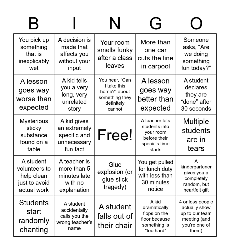 This bingo card has a free space and 40 words: A student calls you “Mom” or “Dad”, Mysterious sticky substance found on a table, Someone bursts into song for no reason, A kid tells you a very long, very unrelated story, A student accidentally calls you the wrong teacher’s name, Glue explosion (or glue stick tragedy), You hear, “Can I take this home?” about something they definitely cannot, “Can I go to the bathroom?” right after you start instructions, Someone asks, “Are we doing something fun today?”, A student volunteers to help clean just to avoid actual work, A kid gives an extremely specific and unnecessary fun fact, More than one car cuts the line in carpool, 4 or less people actually show up to our team meeting (and you’re one of them), Multiple students are in tears, A teacher lets students into your room before their specials time starts, A teacher is more than 5 minutes late with no explanation, * talks to you about puppies, You pick up something that is inexplicably wet, A kindergartener has their shoes off, Your room smells funky after a class leaves, A kindergartener gives you a completely random, but heartfelt gift, A kid dramatically flops on the floor because something is “too hard”, A lesson goes way better than expected, A lesson goes way worse than expected, The office calls for a student who is not in your room, You get told THIS is their favorite special, We have a fire drill NOT on the last day of the month, Alex turns off a light when she enters our meeting, A student says “I didn’t do that” when you watched them do it, 1st grade was your favorite class/lesson today, 2nd grade was your favorite class/lesson today, Students start randomly chanting, Students start randomly singing, You get pulled for lunch duty with less than 30 minutes notice, A student declares they are “done” after 30 seconds, A student falls out of their chair, You get a new student on their first day at Douglas, You have to get creative to get a student to leave your room, A decision is made that affects you without your input and A class is late or misses specials because of a school event.