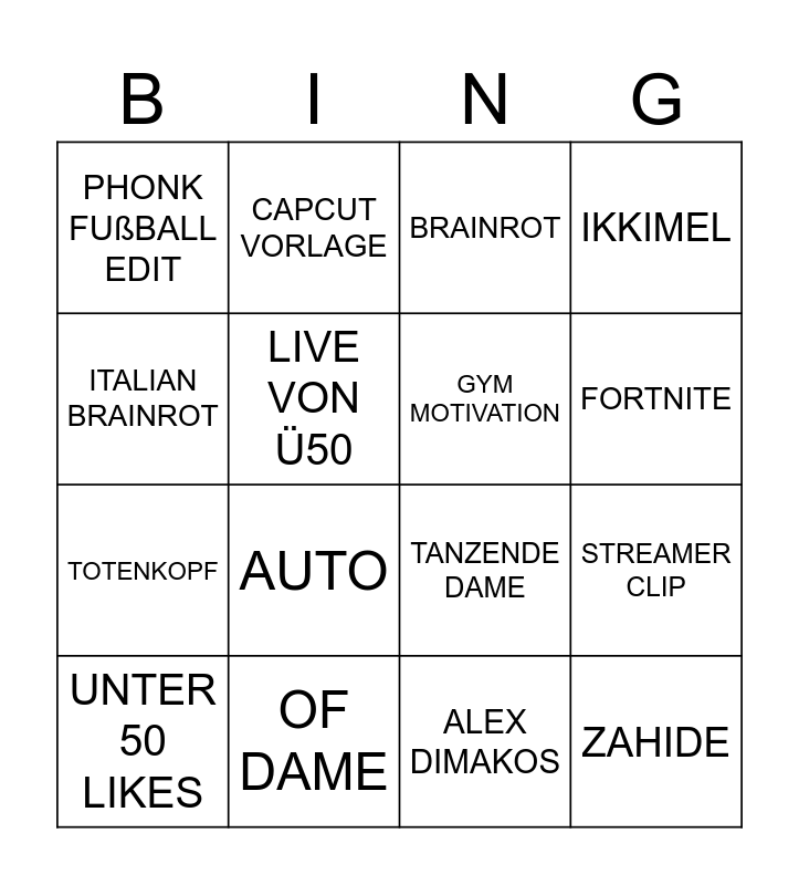 This bingo card has 16 words: OF DAME, STREAMER CLIP, BRAINROT, PHONK FUßBALL EDIT, TOTENKOPF, CAPCUT VORLAGE, TANZENDE DAME, ALEX DIMAKOS, ITALIAN BRAINROT, LIVE VON Ü50, UNTER 50 LIKES, IKKIMEL, AUTO, FORTNITE, GYM MOTIVATION and ZAHIDE.