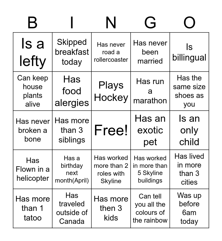 This bingo card has a free space and 24 words: Has a birthday next month(April), Has traveled outside of Canada, Plays Hockey, Has more than 1 tatoo, Is billingual, Is a lefty, Can keep house plants alive, Skipped breakfast today, Has an exotic pet, Has worked more than 2 roles with Skyline, Has run a marathon, Has never broken a bone, Has worked in more than 5 Skyline buildings, Has lived in more than 3 cities, Has food alergies, Can tell you all the colours of the rainbow, Is an only child, Has never road a rollercoaster, Has the same size shoes as you, Has more than 3 siblings, Was up before 6am today, Has Flown in a helicopter, Has never been married and Has more then 3 kids.