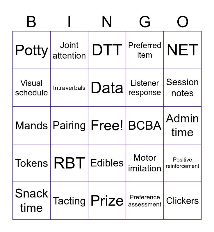 This bingo card has a free space and 24 words: RBT, Tacting, Data, Snack time, NET, Potty, Visual schedule, Joint attention, BCBA, Edibles, Listener response, Mands, Motor imitation, Positive reinforcement, Intraverbals, Preference assessment, Admin time, DTT, Session notes, Pairing, Clickers, Tokens, Preferred item and Prize.