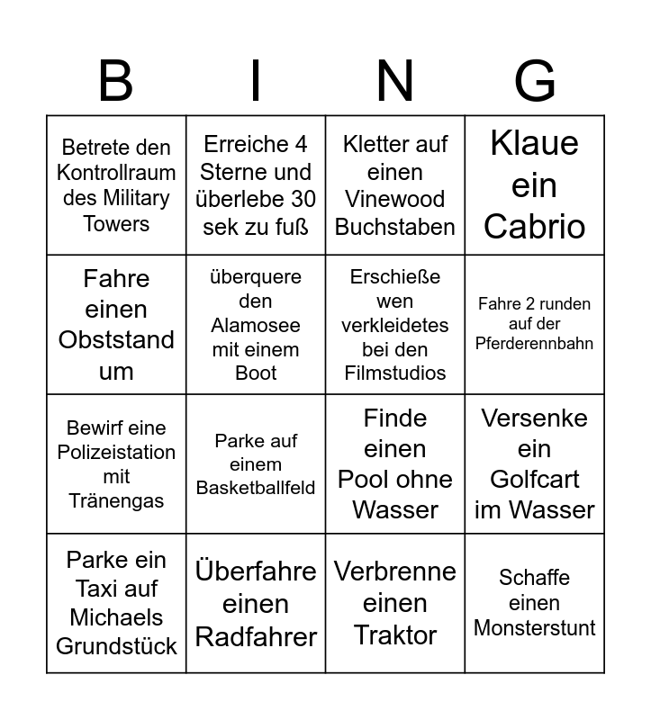 This bingo card has 16 words: Überfahre einen Radfahrer, Versenke ein Golfcart im Wasser, Kletter auf einen Vinewood Buchstaben, Betrete den Kontrollraum des Military Towers, Bewirf eine Polizeistation mit Tränengas, Erreiche 4 Sterne und überlebe 30 sek zu fuß, Finde einen Pool ohne Wasser, Verbrenne einen Traktor, Fahre einen Obststand um, überquere den Alamosee mit einem Boot, Parke ein Taxi auf Michaels Grundstück, Klaue ein Cabrio, Parke auf einem Basketballfeld, Fahre 2 runden auf der Pferderennbahn, Erschieße wen verkleidetes bei den Filmstudios and Schaffe einen Monsterstunt.