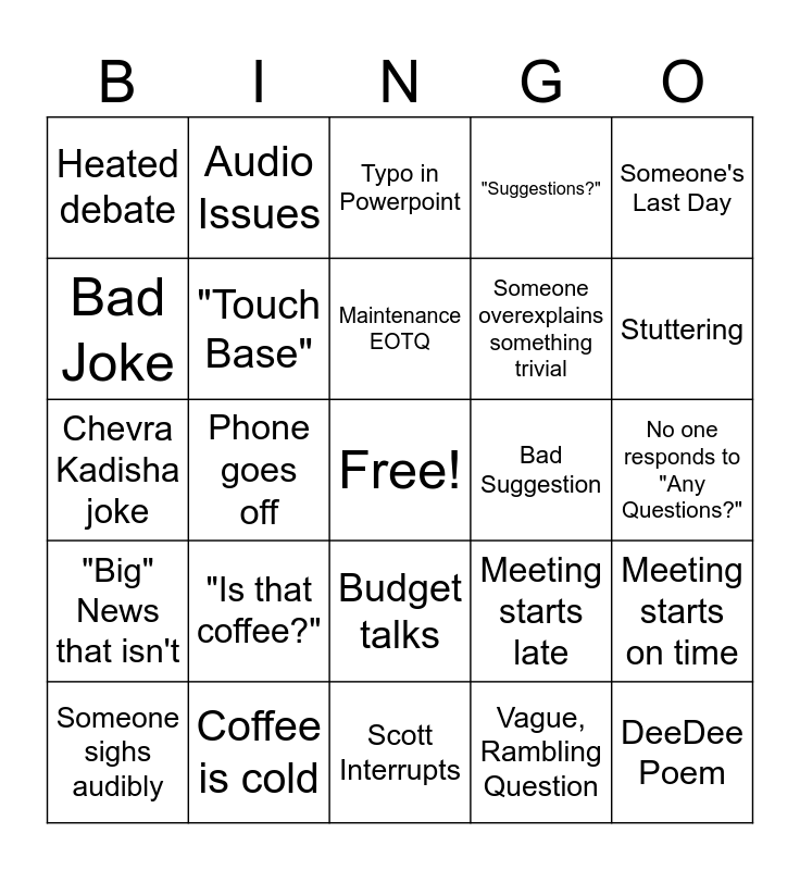 This bingo card has a free space and 46 words: Stupid Question from AP, DeeDee Poem, Tanach Chapel Delayed, Scott Interrupts, "Is that coffee?", No one claps for speaker, Audio Issues, Webcast Issues, Bad Joke, David G. Coughs/Sneezes, "Touch Base", "Suggestions?", Meeting starts on time, Meeting starts late, Meeting runs overtime, New Employees, Maintenance EOTQ, Bad Suggestion, Speaker lost their voice, Someone's Last Day, Phone goes off, Vague, Rambling Question, Heated debate, Someone overexplains something trivial, Someone repeats a just discussed topic, Stuttering, Someone sighs audibly, Topic discussed for over 10 minutes, Budget talks, "Big" News that isn't, An "anonymous" complaint about someone specific, Lunch Room Cleanliness Conversation, "Most Productive Quarter", Updates from IT, Service going on same time as meeting, Coffee is cold, No one responds to "Any Questions?", Wildly personal anecdote, Unprepared speaker, Mediocrity is Celebrated, Speaker is waaay too excited, Typo in Powerpoint, Chevra Kadisha joke, "Streamline", Someone calls out another department and Someone leaves early.