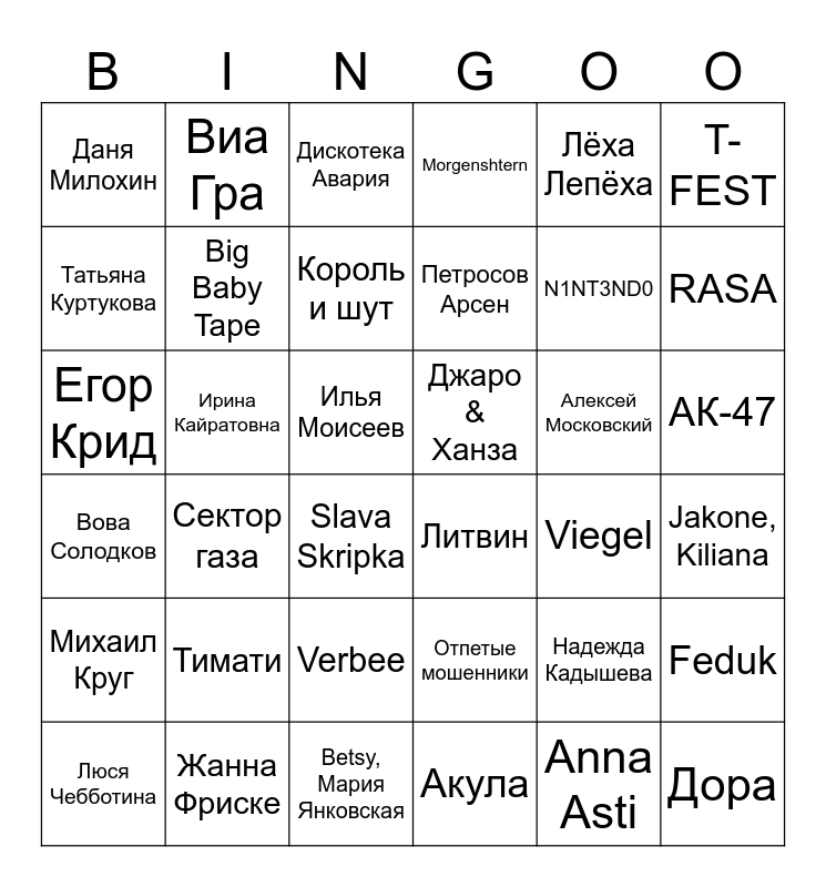 This bingo card has 36 words: Вова Солодков, Сектор газа, Betsy, Мария Янковская, Петросов Арсен, Алексей Московский, АК-47, Даня Милохин, Жанна Фриске, Дискотека Авария, Отпетые мошенники, N1NT3ND0, T-FEST, Михаил Круг, Ирина Кайратовна, Король и шут, Morgenshtern, Надежда Кадышева, Jakone, Kiliana, Татьяна Куртукова, Big Baby Tape, Slava Skripka, Литвин, Viegel, Feduk, Егор Крид, Виа Гра, Илья Моисеев, Акула, Лёха Лепёха, RASA, Люся Чебботина, Тимати, Verbee, Джаро & Ханза, Anna Asti and Дора.