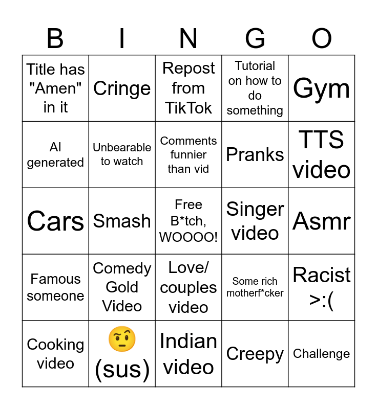 This bingo card has a free space and 24 words: Comedy Gold Video, 🤨 (sus), Comments funnier than vid, Cooking video, Gym, Title has "Amen" in it, AI generated, Cringe, Singer video, Love/ couples video, Pranks, Cars, Some rich motherf*cker, Racist >:(, Unbearable to watch, Creepy, Asmr, Repost from TikTok, TTS video, Smash, Challenge, Famous someone, Tutorial on how to do something and Indian video.