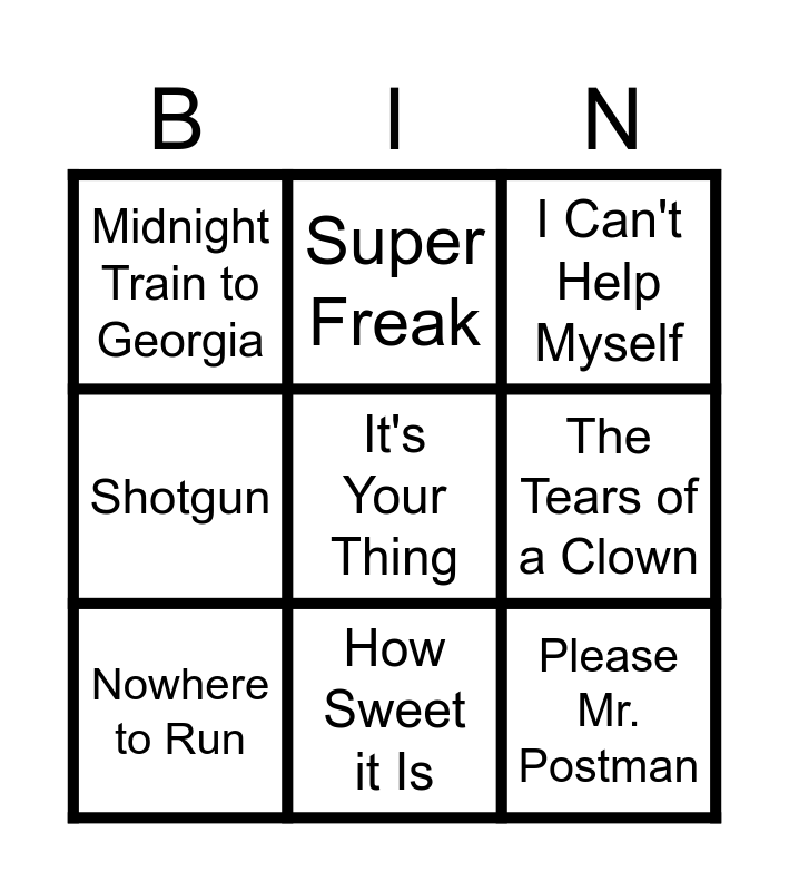 This bingo card has a free space and 17 words: Brick House, Upside Down, I Can't Help Myself, Midnight Train to Georgia, ABC, Shotgun, Say You, Say Me, Nowhere to Run, How Sweet it Is, The Tears of a Clown, My Guy, Billie Jean, Please Mr. Postman, Super Freak, I Just Want to Celebrate, For Once in My Life and My Girl.