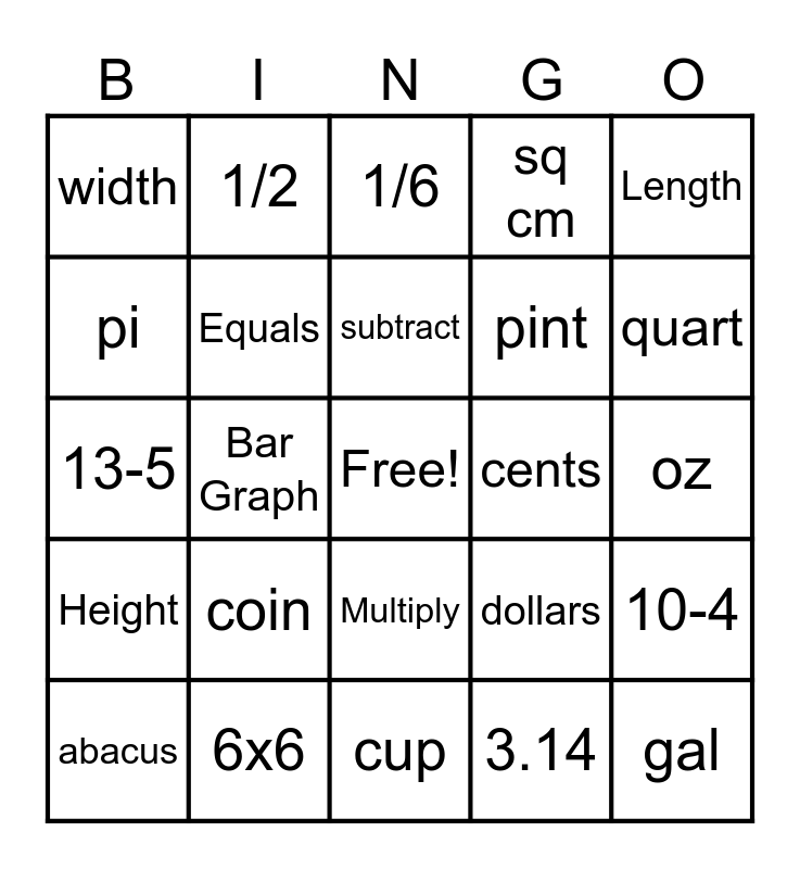 This bingo card has a free space and 39 words: Perimiter, Area, Sum, Equals, abacus, Multiply, subtract, Angle, Length, Height, Bar Graph, sq cm, gal, oz, cents, coin, distance, width, fraction, dollars, pi, cup, pint, quart, quotient, 5x5, 6x8, 0x2, 1/3, 1/2, 1/4, 1/8, 1/6, 6x6, 3.14, 8oz, 10-4, 13-5 and 9x9.