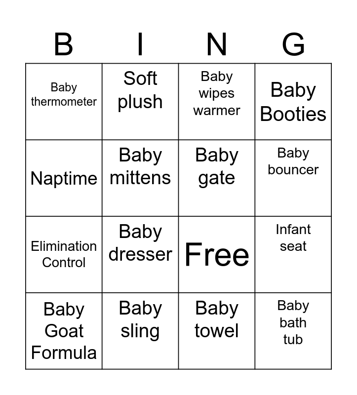 This bingo card has 16 words: Baby sling, Infant seat, Baby wipes warmer, Baby thermometer, Elimination Control, Soft plush, Free, Baby towel, Naptime, Baby mittens, Baby Goat Formula, Baby Booties, Baby dresser, Baby bouncer, Baby gate and Baby bath tub.