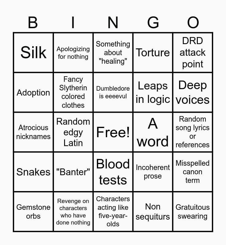 This bingo card has a free space and 34 words: "Older man" and "boy", Non sequiturs, Characters laughing at unfunny jokes, Impossible descriptions, Snakes, Fancy Slytherin colored clothes, DRD attack point, Gemstone orbs, Apologizing for nothing, Soulmates, Dumbledore is eeeevul, Something about "healing", Mental health, "Dark is not bad", A word, Deep voices, Revenge on characters who have done nothing, Atrocious nicknames, "Banter", Incoherent prose, Blood tests, Original magic, Silk, Random song lyrics or references, Characters acting like five-year-olds, Gratuitous swearing, Torture, Anachronisms, Leaps in logic, Adoption, Reiterating known information, Random edgy Latin, Misspelled canon term and It's unclear who's talking.