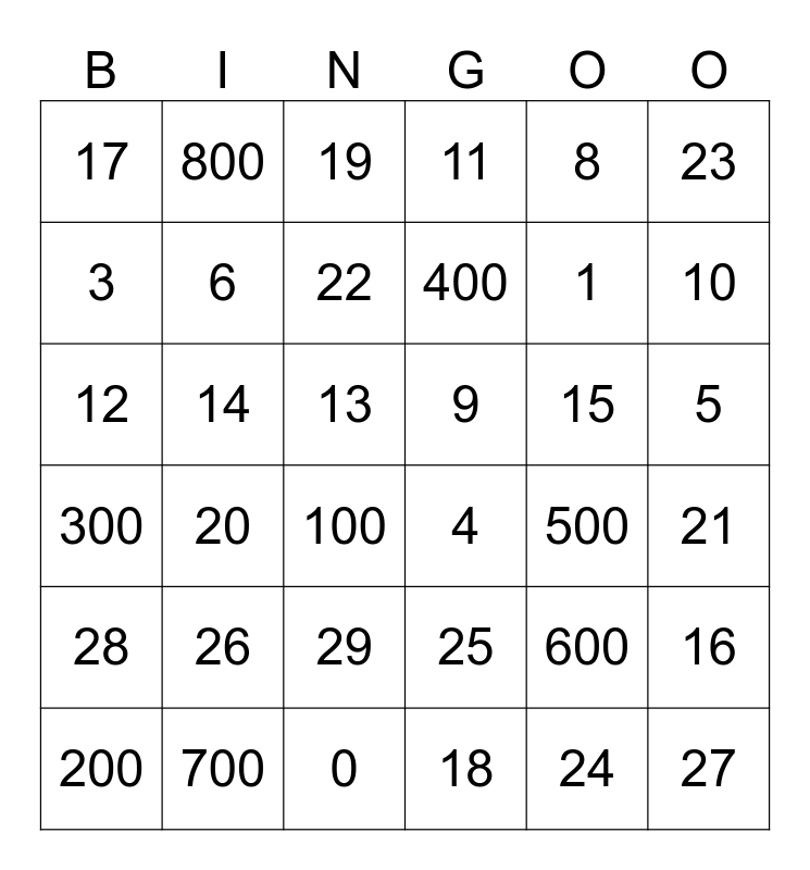 This bingo card has 40 words: 0, 1, 2, 3, 4, 5, 6, 7, 8, 9, 10, 11, 12, 13, 14, 15, 16, 17, 18, 19, 20, 21, 22, 23, 24, 25, 26, 27, 28, 29, 30, 100, 200, 300, 400, 500, 600, 700, 800 and 900.
