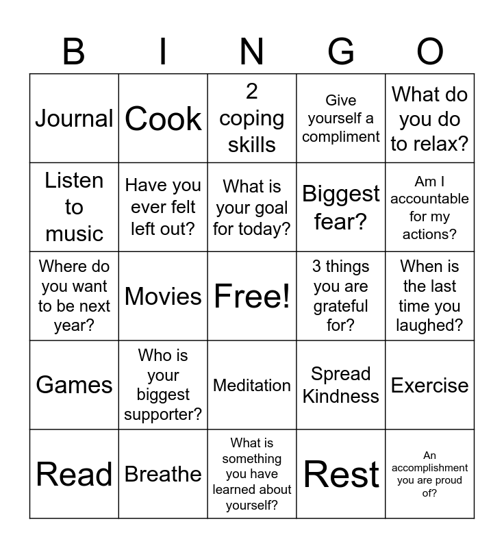 This bingo card has a free space and 24 words: Who is your biggest supporter?, Breathe, What is your goal for today?, Read, What do you do to relax?, Journal, Listen to music, Cook, 3 things you are grateful for?, Meditation, Biggest fear?, Where do you want to be next year?, Spread Kindness, Exercise, Have you ever felt left out?, Rest, When is the last time you laughed?, 2 coping skills, Am I accountable for my actions?, Movies, An accomplishment you are proud of?, Games, Give yourself a compliment and What is something you have learned about yourself?.