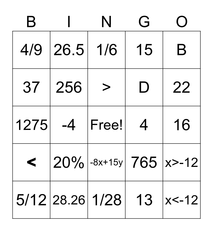 This bingo card has a free space and 29 words: 5/12, 1 1/2, -4, yes, 4/9, 1/6, 256, 20%, 4, 28.26, 16, x<-12, 1/28, 13, 22, 21.5, -8x+15y, <, B, 1275, 765, 33, D, 37, 15, 26.5, x>-12, > and 4x+10y.