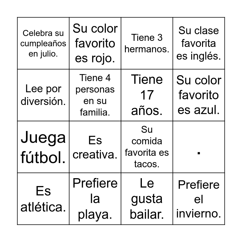 This bingo card has 22 words: Prefiere la playa., Prefiere las montañas., Su color favorito es rojo., Tiene un perro., Tiene 4 personas en su familia., Tiene 17 años., Celebra su cumpleaños en julio., Tiene 3 hermanos., Su comida favorita es tacos., Prefiere el invierno., Juega fútbol., Su clase favorita es inglés., ., Quiere tener una familia grande., Le gusta bailar., Prefiere escuchar música., ., Es atlética., Es creativa., Lee por diversión., Su color favorito es azul. and \.
