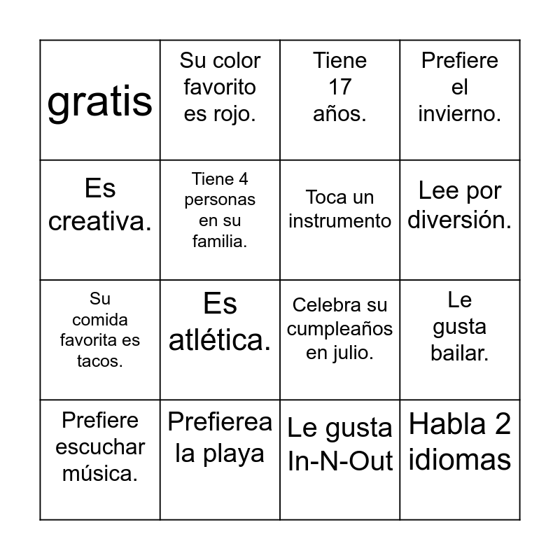 This bingo card has 22 words: Prefierea la playa, Prefiere las montañas., Su color favorito es rojo., Tiene un perro., Tiene 4 personas en su familia., Toca un instrumento, gratis, Tiene 17 años., Celebra su cumpleaños en julio., Habla 2 idiomas, Su comida favorita es tacos., Prefiere el invierno., Juega fútbol., Su clase favorita es inglés., Le gusta In-N-Out, Tiene un gato, Le gusta bailar., Prefiere escuchar música., Es atlética., Es creativa., Lee por diversión. and Su color favorito es azul..