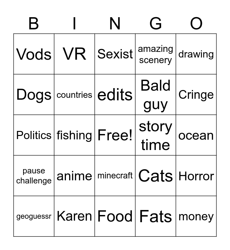 This bingo card has a free space and 39 words: Hot takes, Musik ranking, funny clips, countries, geoguessr, minecraft, edits, cars, drawing, pause challenge, fishing, amazing scenery, money, ocean, story time, anime, pokemon cards, Vods, Racist, Cats, Dogs, Food, Bald guy, Cringe, rage, face cam, family, dating, IT stuff, VR, TV Show, Exposed video, Sexist, Karen, Fats, Crazy Challenge, Horror, Politics and Sports.