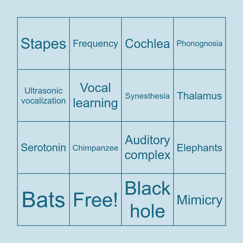 This bingo card has 21 words: Free!, Hertz, Frequency, 25,000 hertz, Black hole, Synesthesia, Stapes, Cochlea, Auditory complex, Thalamus, Serotonin, Phonognosia, Mimicry, Parrots, Vocal learning, Echolocation, Bats, Chimpanzee, Ultrasonic vocalization, Elephants and Sperm whale.
