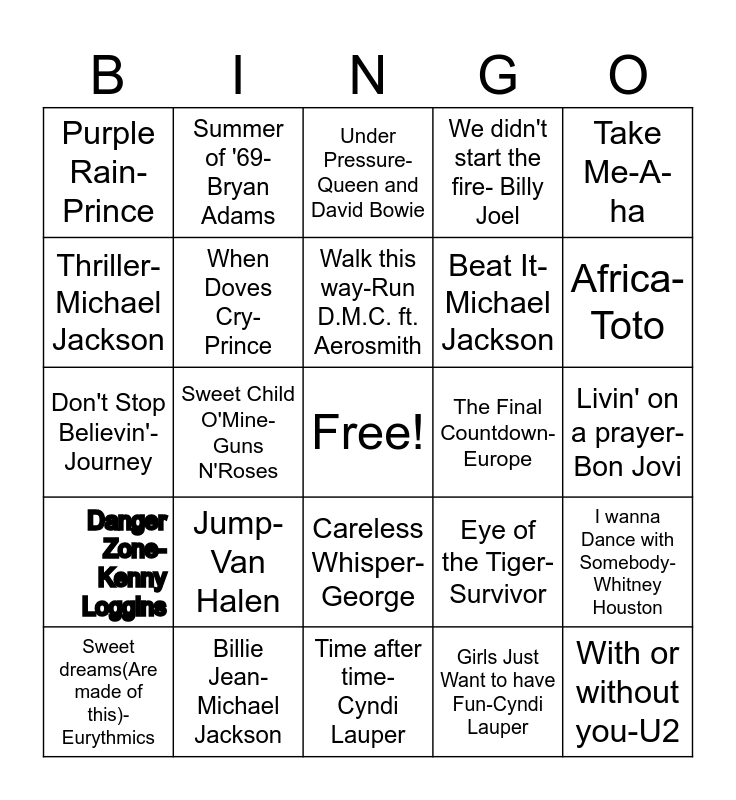 This bingo card has a free space and 24 words: Jump-Van Halen, Billie Jean-Michael Jackson, Walk this way-Run D.M.C. ft. Aerosmith, Sweet dreams(Are made of this)-Eurythmics, Take Me-A-ha, Purple Rain-Prince, Thriller-Michael Jackson, Summer of '69-Bryan Adams, The Final Countdown-Europe, Careless Whisper- George, Beat It- Michael Jackson, Don't Stop Believin'- Journey, Eye of the Tiger-Survivor, I wanna Dance with Somebody-Whitney Houston, When Doves Cry-Prince, Girls Just Want to have Fun-Cyndi Lauper, Livin' on a prayer-Bon Jovi, Under Pressure-Queen and David Bowie, Africa-Toto, Sweet Child O'Mine-Guns N'Roses, With or without you-U2, Danger Zone-Kenny Loggins, We didn't start the fire- Billy Joel and Time after time-Cyndi Lauper.