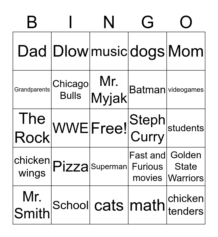 This bingo card has a free space and 24 words: Pizza, School, Mr. Myjak, Mr. Smith, Mom, Dad, Grandparents, Dlow, Steph Curry, Superman, Batman, The Rock, Fast and Furious movies, Golden State Warriors, Chicago Bulls, math, students, music, videogames, WWE, chicken tenders, chicken wings, dogs and cats.