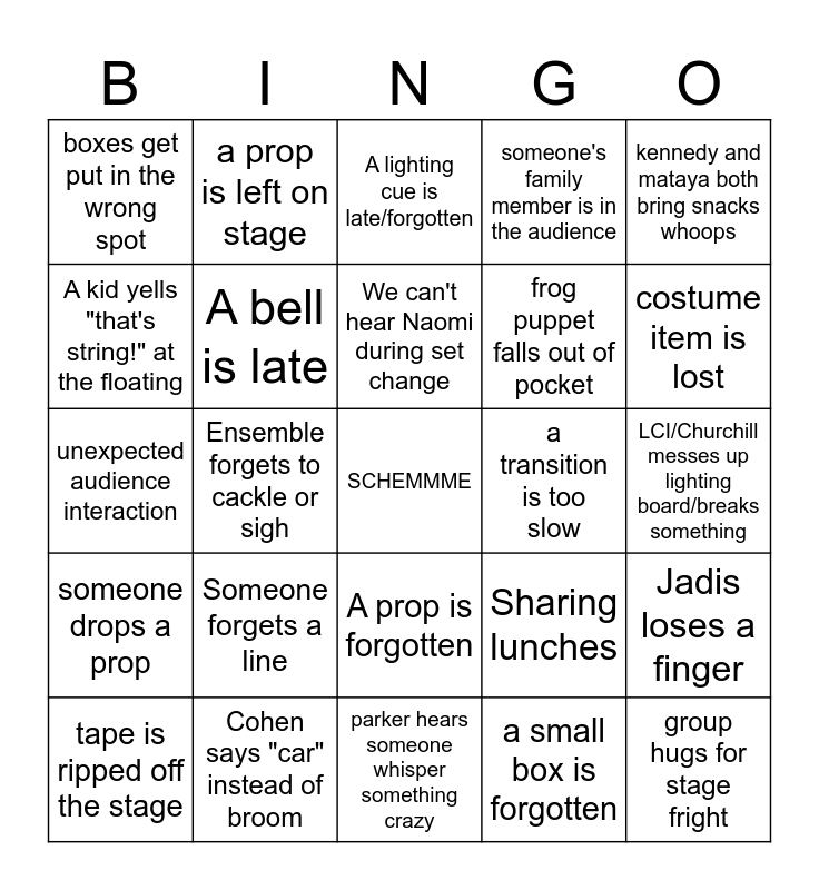 This bingo card has a free space and 24 words: Someone forgets a line, Cohen says "car" instead of broom, We can't hear Naomi during set change, tape is ripped off the stage, kennedy and mataya both bring snacks whoops, boxes get put in the wrong spot, A kid yells "that's string!" at the floating, a prop is left on stage, a transition is too slow, A prop is forgotten, frog puppet falls out of pocket, unexpected audience interaction, Sharing lunches, Jadis loses a finger, A bell is late, a small box is forgotten, LCI/Churchill messes up lighting board/breaks something, A lighting cue is late/forgotten, costume item is lost, Ensemble forgets to cackle or sigh, group hugs for stage fright, someone drops a prop, someone's family member is in the audience and parker hears someone whisper something crazy.