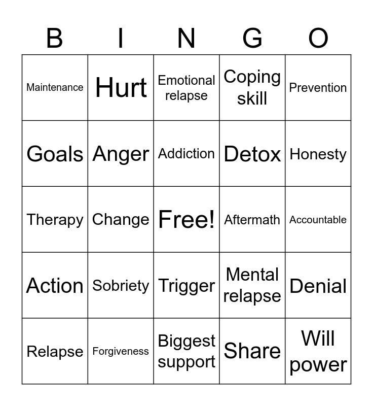This bingo card has a free space and 24 words: Sobriety, Forgiveness, Addiction, Relapse, Prevention, Maintenance, Goals, Hurt, Aftermath, Trigger, Detox, Therapy, Mental relapse, Denial, Anger, Share, Accountable, Emotional relapse, Honesty, Change, Will power, Action, Coping skill and Biggest support.