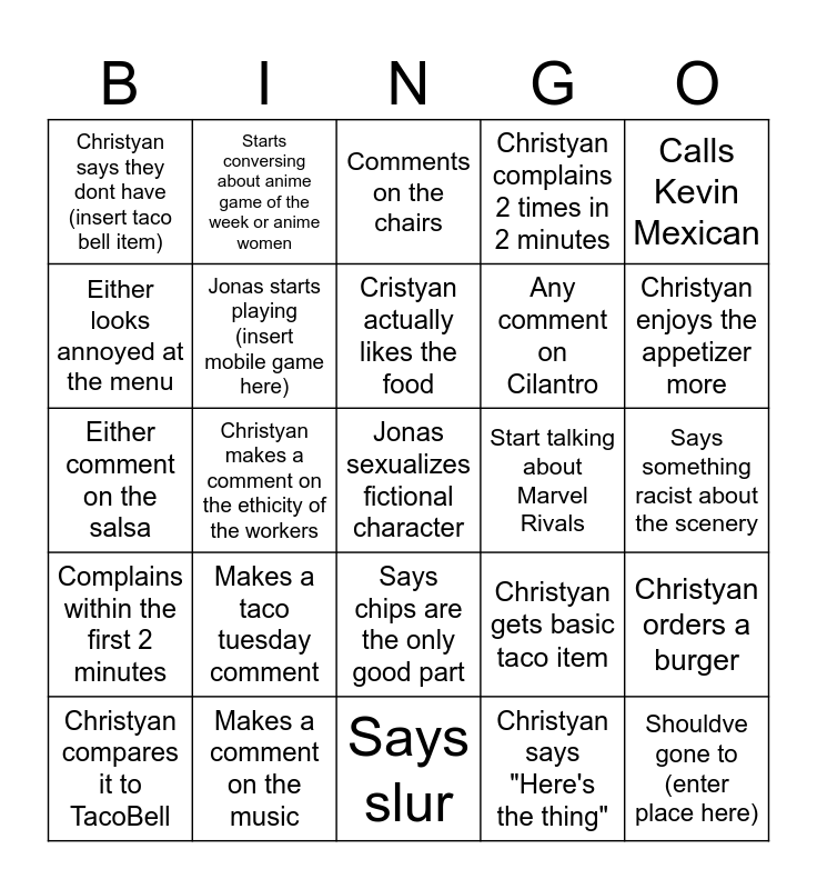 This bingo card has a free space and 25 words: Makes a taco tuesday comment, Says slur, Cristyan actually likes the food, Christyan compares it to TacoBell, Calls Kevin Mexican, Christyan says they dont have (insert taco bell item), Either looks annoyed at the menu, Starts conversing about anime game of the week or anime women, Start talking about Marvel Rivals, Says chips are the only good part, Any comment on Cilantro, Either comment on the salsa, Christyan gets basic taco item, Christyan orders a burger, Jonas starts playing (insert mobile game here), Either one of them go to the bathroom, Says something racist about the scenery, Comments on the chairs, Christyan enjoys the appetizer more, Christyan makes a comment on the ethicity of the workers, Shouldve gone to (enter place here), Makes a comment on the music, Complains within the first 2 minutes, Christyan complains 2 times in 2 minutes and Christyan says "Here's the thing".