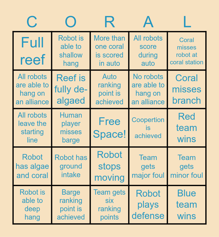 This bingo card has a free space and 31 words: Team gets six ranking points, Close scores (within 5 points), Human player misses barge, R2JESU wins!!!, Full reef, More than one coral is scored in auto, Reef is fully de-algaed, Team gets major foul, Coopertion is achieved, Robot plays defense, Red team wins, Blue team wins, Robot scores algae into barge, Coral gets stuck in robot, Coral misses branch, Coral scored on all 4 levels, Team gets minor foul, Robot has ground intake, Robot has algae and coral, Robot stops moving, Coral misses robot at coral station, Team name is mispronounced, Robot is able to deep hang, Robot is able to shallow hang, No robots are able to hang on an alliance, All robots are able to hang on an alliance, All robots score during auto, All robots leave the starting line, Barge ranking point is achieved, Auto ranking point is achieved and Robot hangs before endgame.