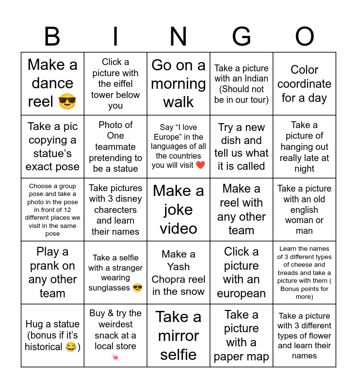 This bingo card has a free space and 24 words: Take a selfie with a stranger wearing sunglasses 😎, Buy & try the weirdest snack at a local store 🍬, Say “I love Europe” in the languages of all the countries you will visit ❤️, Hug a statue (bonus if it’s historical 😂), Color coordinate for a day, Make a dance reel 😎, Take a pic copying a statue’s exact pose, Click a picture with the eiffel tower below you, Make a reel with any other team, Make a Yash Chopra reel in the snow, Try a new dish and tell us what it is called, Choose a group pose and take a photo in the pose in front of 12 different places we visit in the same pose, Click a picture with an european, Learn the names of 3 different types of cheese and breads and take a picture with them ( Bonus points for more), Photo of One teammate pretending to be a statue, Take a picture with a paper map, Take a picture with an old english woman or man, Go on a morning walk, Take a picture of hanging out really late at night, Take pictures with 3 disney charecters and learn their names, Take a picture with 3 different types of flower and learn their names, Play a prank on any other team, Take a picture with an Indian (Should not be in our tour) and Take a mirror selfie.