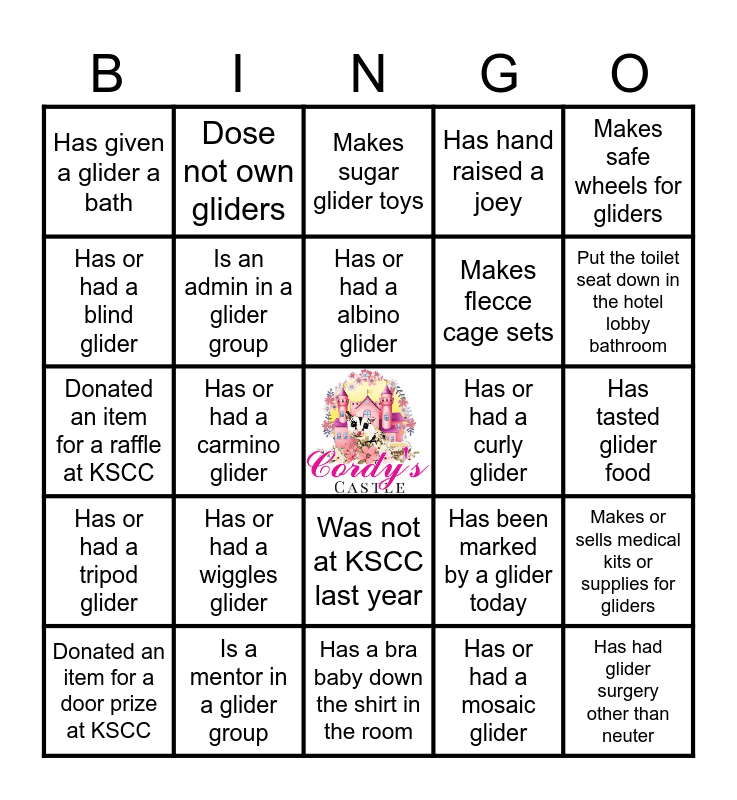 This bingo card has a free space and 24 words: Has or had a wiggles glider, Is a mentor in a glider group, Has or had a albino glider, Donated an item for a door prize at KSCC, Makes safe wheels for gliders, Has given a glider a bath, Has or had a blind glider, Dose not own gliders, Has or had a curly glider, Was not at KSCC last year, Makes flecce cage sets, Donated an item for a raffle at KSCC, Has been marked by a glider today, Makes or sells medical kits or supplies for gliders, Is an admin in a glider group, Has or had a mosaic glider, Has tasted glider food, Makes sugar glider toys, Put the toilet seat down in the hotel lobby bathroom, Has or had a carmino glider, Has had glider surgery other than neuter, Has or had a tripod glider, Has hand raised a joey and Has a bra baby down the shirt in the room.