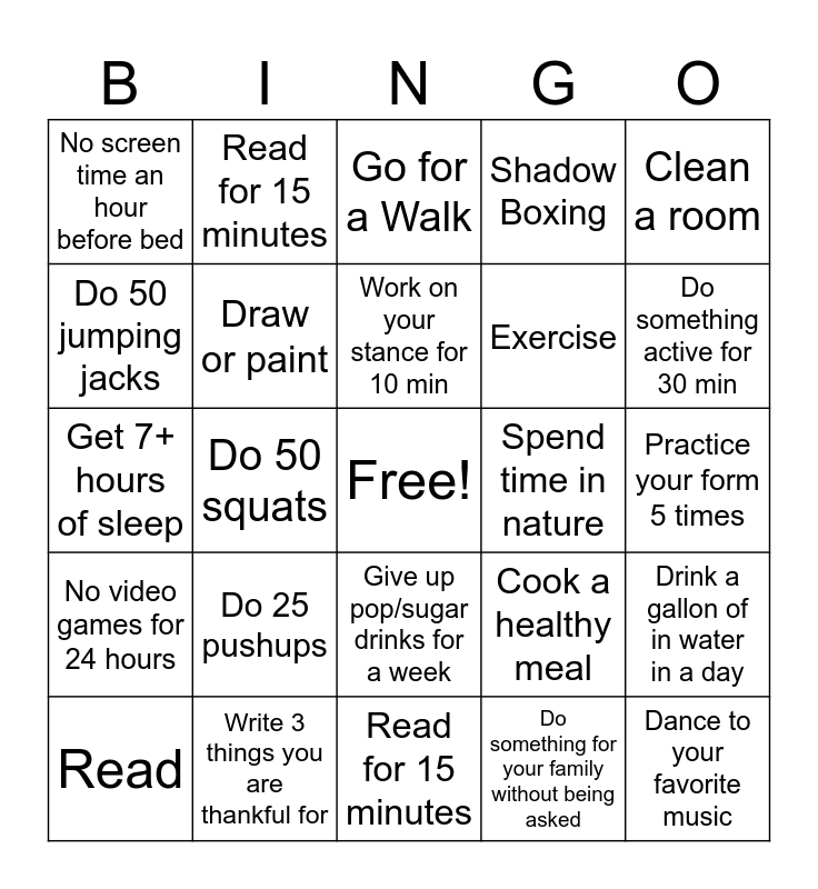This bingo card has a free space and 29 words: Read, Weed or plant flowers in a garden, Do 50 squats, Kicking drills for 10 min, No screen time an hour before bed, Go for a Walk, Draw or paint, Do 25 pushups, Spend time in nature, Write 3 things you are thankful for, Practice your form 5 times, Dance to your favorite music, Read for 15 minutes, Do something for your family without being asked, Do something active for 30 min, Go for a hike, Give up pop/sugar drinks for a week, No video games for 24 hours, Clean a room, Get 7+ hours of sleep, Cook a healthy meal, Get outside! Enjoy the sun, Exercise, Do 50 jumping jacks, Shadow Boxing, Read for 15 minutes, Drink a gallon of in water in a day, Work on your stance for 10 min and Play a game with family (inside or outside).