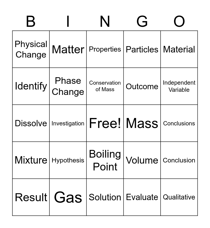 This bingo card has a free space and 86 words: Analyze, Atom, Boiling Point, Chemical Change, Chemical Property, Classification, Colloid, Color, Communicate, Composition, Condensation, Conductivity, Conclusion, Conclusions, Conserved, Conservation of Mass, Data, Decision, Decisions, Density, Describe, Develop, Dissolve, Energy, Evaluate, Evaporation, Evidence, Experiment, Experiment Variables, Freezing Point, Gas, Graph, Heating, Hypothesis, Identify, Impact, Independent Variable, Interaction, Interpret, Investigation, Invisible, Liquid, Magnetism, Mass, Mass vs. Weight, Material, Materials, Matter, Measurement, Measure, Melting Point, Microscopic, Mixture, Mixing, Model, Molecule, Observation, Outcome, Particles, Phase Change, Physical Change, Physical Property, Physical vs. Chemical Change, Prediction, Pressure, Properties, Properties of Matter, Qualitative, Quantitative, Quantity, Reaction, Reflectivity, Result, Scientific, Solid, Solubility, Solution, Solution vs. Mixture, State of Matter, Substance, Temperature, Texture, Total, Utilize, Volume and Weight.