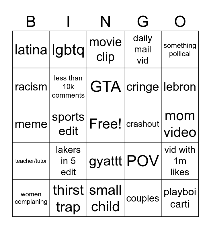 This bingo card has a free space and 24 words: lakers in 5 edit, thirst trap, GTA, women complaning, something pollical, latina, racism, lgbtq, crashout, gyattt, cringe, meme, POV, vid with 1m likes, less than 10k comments, couples, mom video, movie clip, lebron, sports edit, playboi carti, teacher/tutor, daily mail vid and small child.