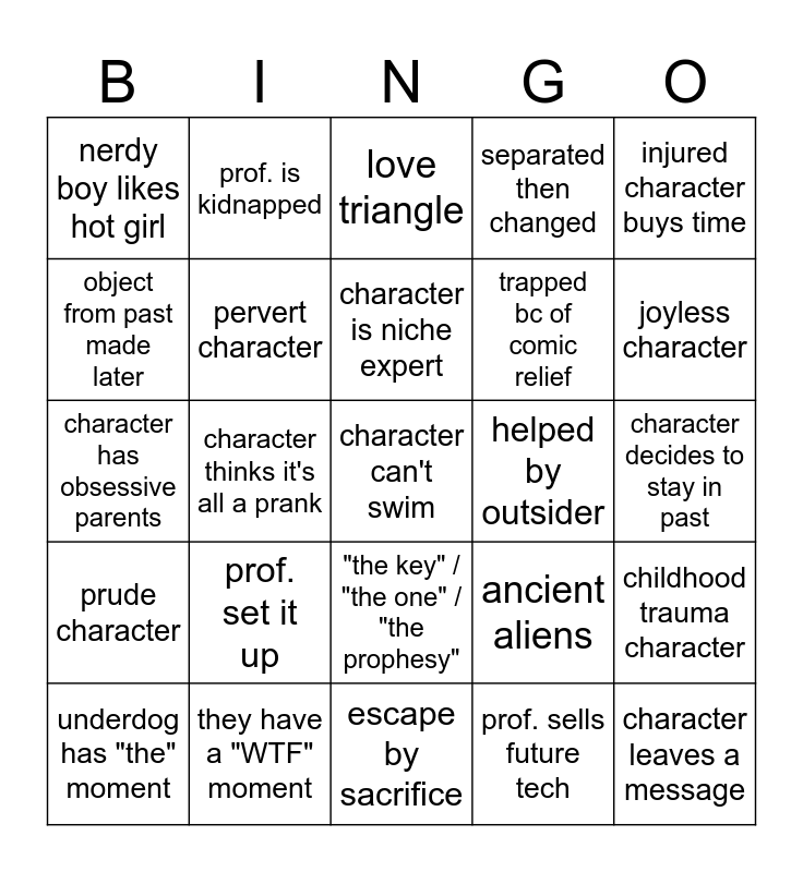 This bingo card has 25 words: prof. set it up, escape by sacrifice, character is niche expert, underdog has "the" moment, injured character buys time, nerdy boy likes hot girl, object from past made later, prof. is kidnapped, helped by outsider, "the key" / "the one" / "the prophesy", trapped bc of comic relief, character has obsessive parents, ancient aliens, childhood trauma character, pervert character, character leaves a message, character decides to stay in past, love triangle, joyless character, character thinks it's all a prank, character can't swim, they have a "WTF" moment, prude character, separated then changed and prof. sells future tech.