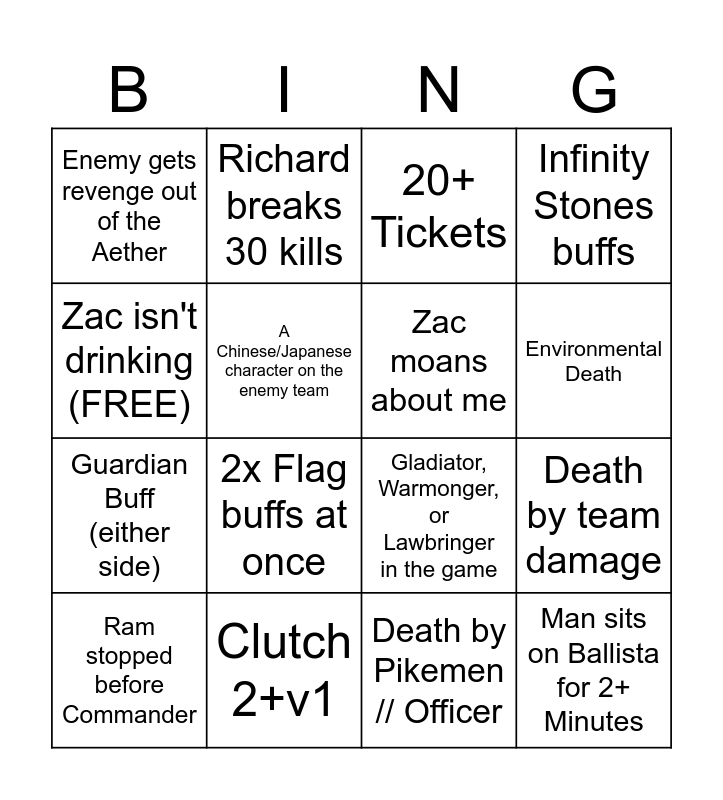 This bingo card has 16 words: Clutch 2+v1, Death by team damage, 20+ Tickets, Enemy gets revenge out of the Aether, Guardian Buff (either side), Richard breaks 30 kills, Gladiator, Warmonger, or Lawbringer in the game, Death by Pikemen // Officer, Zac isn't drinking (FREE), A Chinese/Japanese character on the enemy team, Ram stopped before Commander, Infinity Stones buffs, 2x Flag buffs at once, Environmental Death, Zac moans about me and Man sits on Ballista for 2+ Minutes.