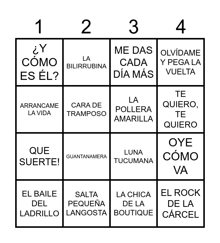 This bingo card has 90 words: FIESTA, VIVIR ASÍ ES MORIR DE AMOR, CÓMO TE EXTRAÑO MI AMOR, DE BOLICHE EN BOLICHE, ESTOY HECHO UN DEMONIO, NOELIA, SI NO TE HUBIERAS IDO, QUÉ PAR DE PÁJAROS, AMOR PIRATA, LIBRE, UN BESO Y UNA FLOR, AMÉRICA, AMÉRICA, UN VELERO LLAMADO LIBERTAD, LA CHICA DE LA BOUTIQUE, DECÍ POR QUÉ NO QUERÉS, TE QUIERO, TE QUIERO, PROCURO OLVIDARTE, DUEÑO DE NADA, ME VA, ME VA, MAÑANA POR LA MAÑANA, POR UNA CABEZA, CAMBALACHE, LA PULPERA DE SANTA LUCÍA, ZAMBA DE MI ESPERANZA, LUNA TUCUMANA, LA LEY Y LA TRAMPA, AMOR SALVAJE, MI BUENOS AIRES QUERIDO, LA MEDIA VUELTA, POPOTITOS, DESPEINADA, VIVA LA VIDA, LA PLAGA, EL ROCK DE LA CÁRCEL, ¿Y CÓMO ES ÉL?, OLVÍDAME Y PEGA LA VUELTA, ME DAS CADA DÍA MÁS, LA BAMBA, OYE CÓMO VA, GUANTANAMERA, A MI MANERA, CARA DE TRAMPOSO, UN MUCHACHO COMO YO, MALENA, SE DICE DE MI, ELLA, ELLA YA ME OLVIDO, SE PARECE A MI MAMA, EL DÍA QUE ME QUIERAS, SEVILLA TIERRA DE AMORES, CAMPO AFUERA, EL CARDENAL, QUE SUERTE!, TIRITANDO, UN DÍA DE PASEO EN SANTA FE, UN MILLÓN DE AMIGOS, VOS SOS UN CARADURA, SALTA PEQUEÑA LANGOSTA, DULCE DANIELA, COSITA LINDA, EL FIRULETE, QUE LA DEJEN IR AL BAILE SOLA, EL EXTRAÑO DEL PELO LARGO, LA REINA DE LA CANCIÓN, BAILANDO EN UNA PATA, LIBRE, SOLTERITO Y SIN NADIE, CORAZÓN CONTENTO, QUIZAS QUIZAS QUIZAS, POMPA DE JABÓN, TE QUIERO VER BAILAR, VUELVE PRIMAVERA, BUENAS NOCHES QUERIDOS CONEJOS, EL BAILE DEL LADRILLO, HAY QUE VENIR AL SUR, NARANJO EN FLOR, LA BILIRRUBINA, LA POLLERA AMARILLA, QUE TENDRÁ ESE PETISO, LA FIESTA, A PARTIR DE MAÑANA, EL CAMALEON, EL ORANGUTÁN, ARRANCAME LA VIDA, MARINERO DE LUCES, CASTILLOS EN EL AIRE, AZÚCAR, PIMIENTA Y SAL, ALGO CONTIGO, DUERME NEGRITO, RELOJ NO MARQUES LAS HORAS, SOLAMENTE UNA VEZ and CANCIÓN PARA CARITO.